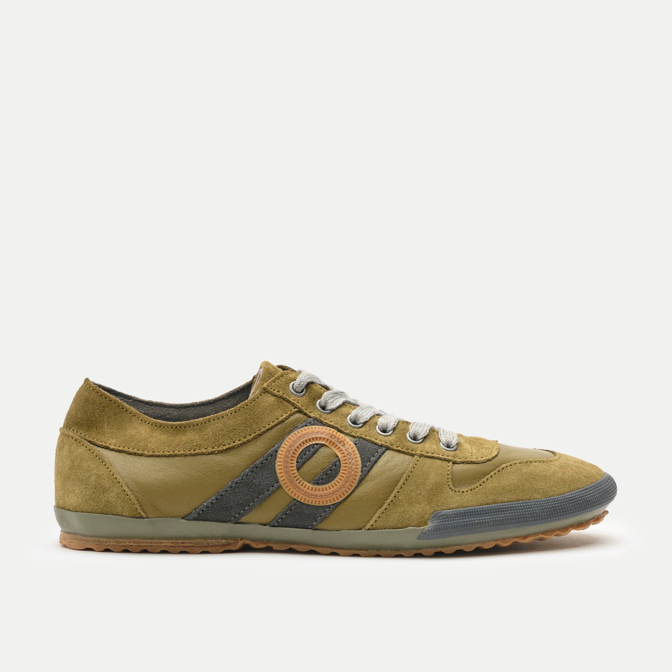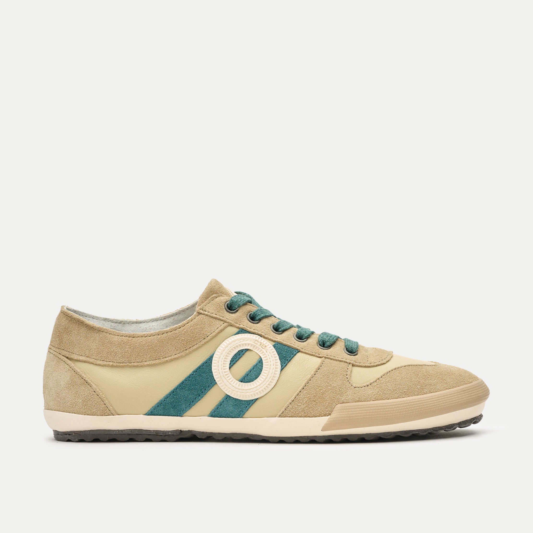 Flacher Sneaker in gedämpftem Artischockengrün mit klassischer Retro-Silhouette. Bequem, vielseitig und mühelos lässig - genau die Art von Schuh, die zu fast allem in deinem Kleiderschrank passt.