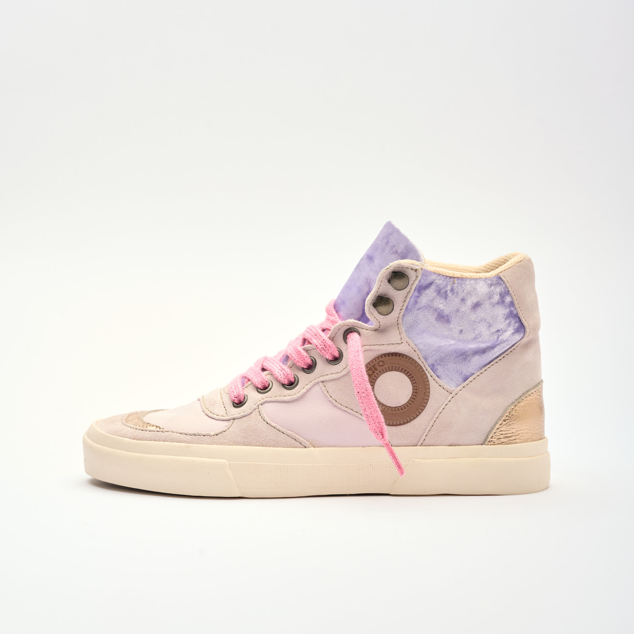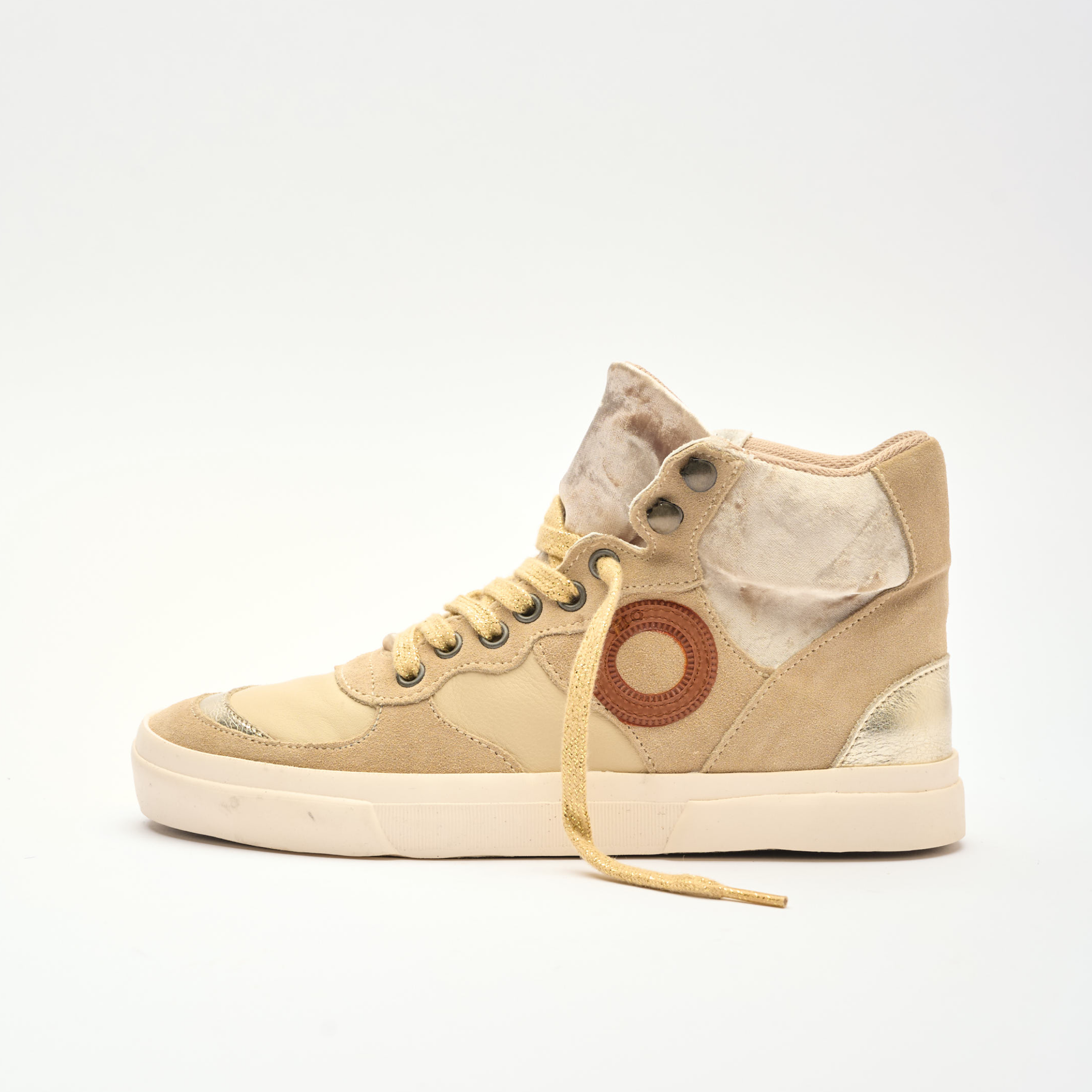 Textured, luxe, and a little nostalgic. The Emma Wash in Cream blends velvet, suede, and leather lamé into a high-top that feels both retro and refined—comfortable enough for every day, bold enough to turn heads.